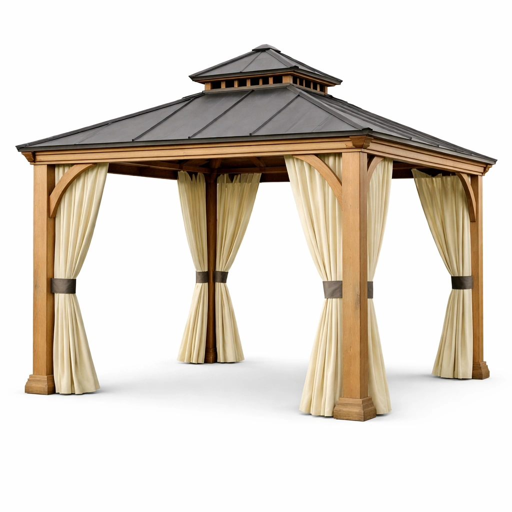 Materiales: estructura de madera de cedro, techo de acero galvanizado y cortinas de poliéster.